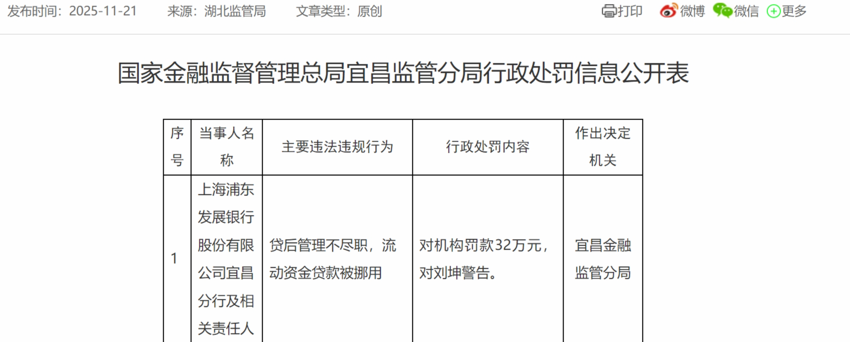 11月21日,国家金融监督管理总局宜昌监管分局行政处罚信息公开表显示,上海浦发银行宜昌分行,贷后管理不尽职配资概念股票,流动资金贷款被挪用,被罚款32万元;相关责任人刘坤被警告。