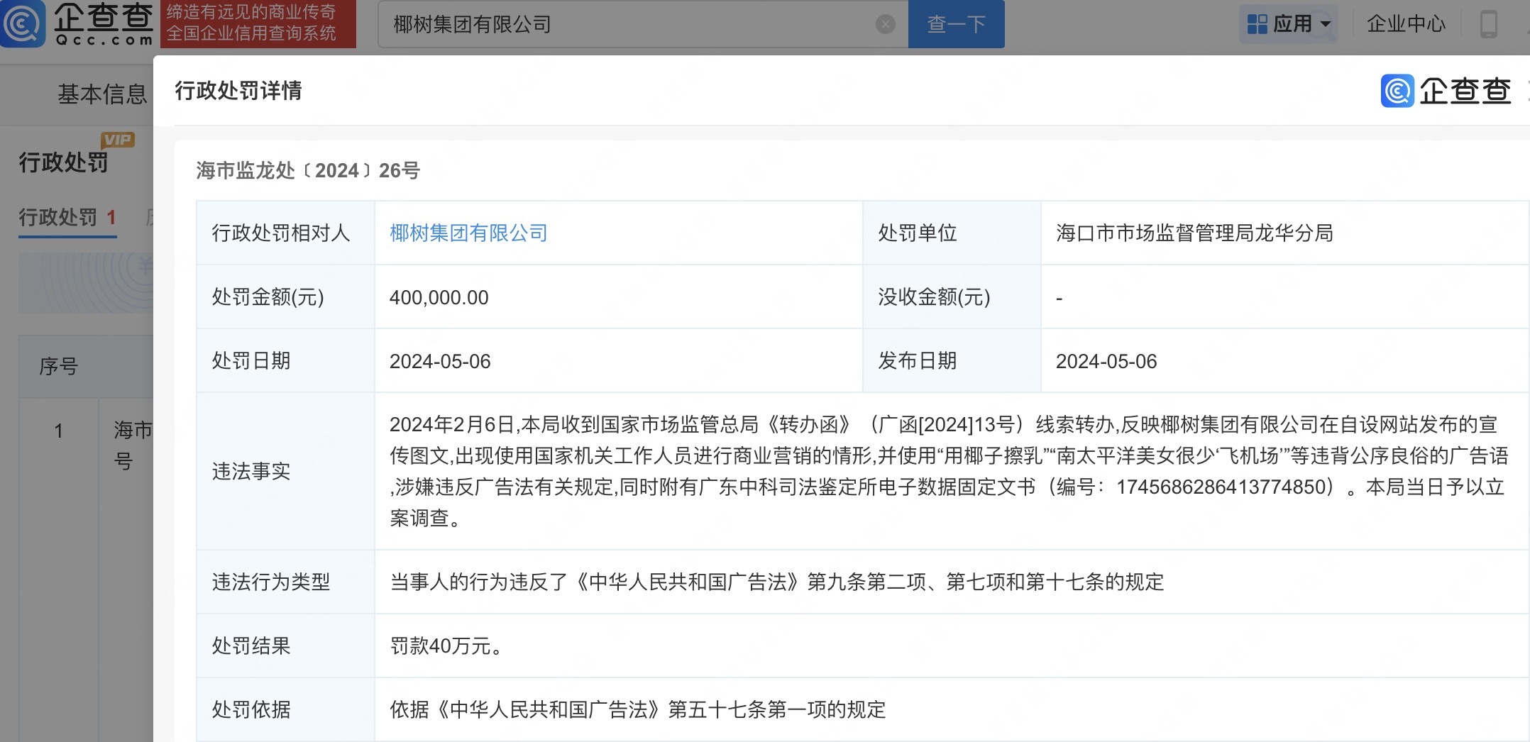 2024年5月,该公司曾因广告含有妨碍社会公共秩序和违背社会良好风尚的内容和情形,被海口市市场监督管理局龙华分局罚款40万元。