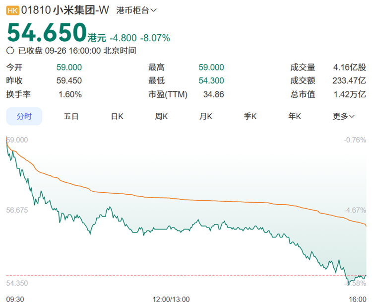 小米今日股价却大跌8.07%,市值直接蒸发约1200亿港元。根据数据配资概念股票,昨日小米港股收盘价为58.450港元,而今日股价一降再降,最终收盘价为54.650港元。