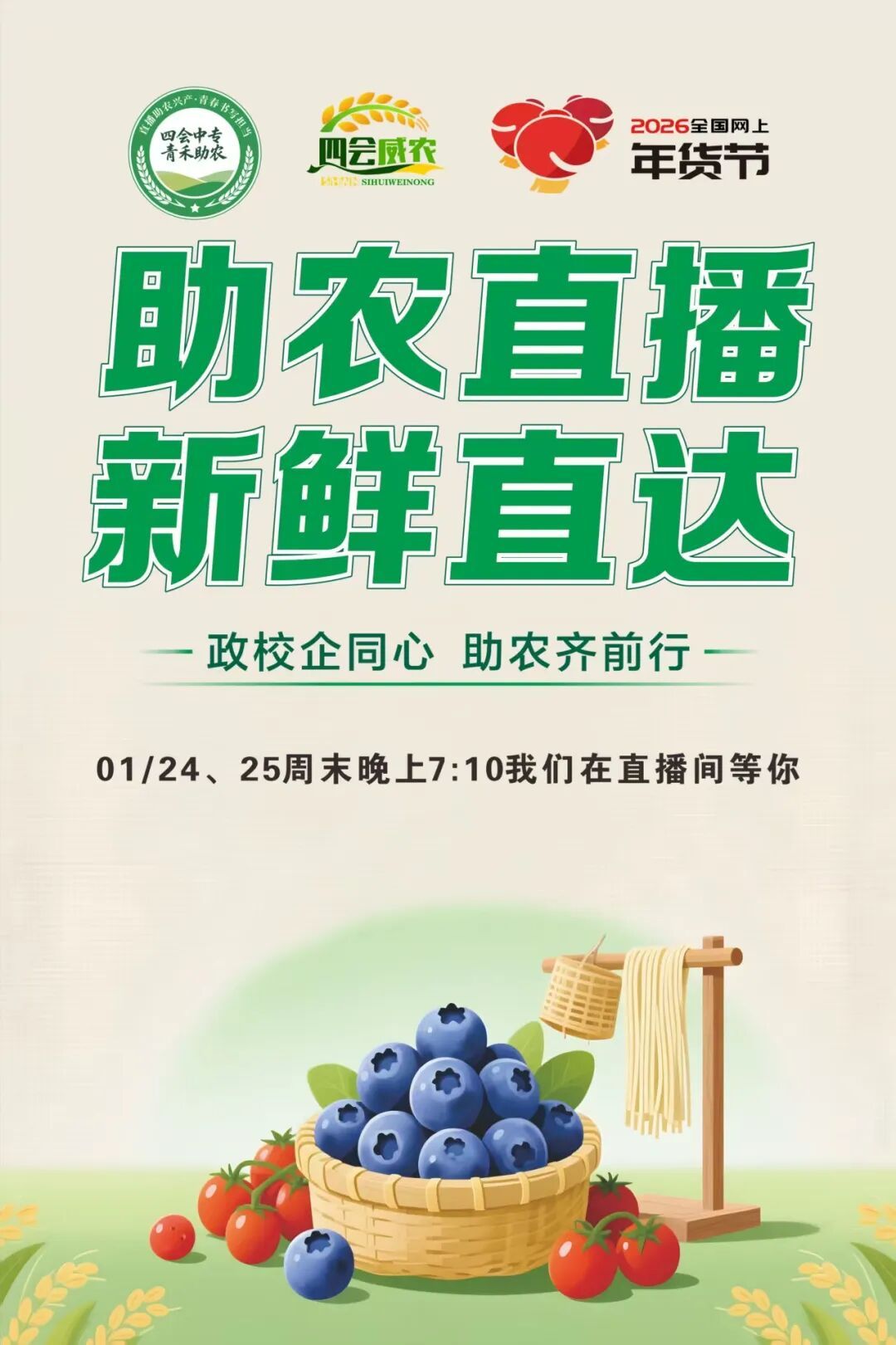 1月24日晚上7:10,由威整镇人民政府、四会市威农农业发展有限公司与四会中专共同打造的“青禾助农”电商直播首播将正式启动。本次直播聚焦威整镇优质农产品,重点推介蓝莓、圣女果等本土特色物产,旨在通过电商新渠道,拓展销售路径,切实助力农业增效、农民增收,以实际行动践行乡村振兴战略。