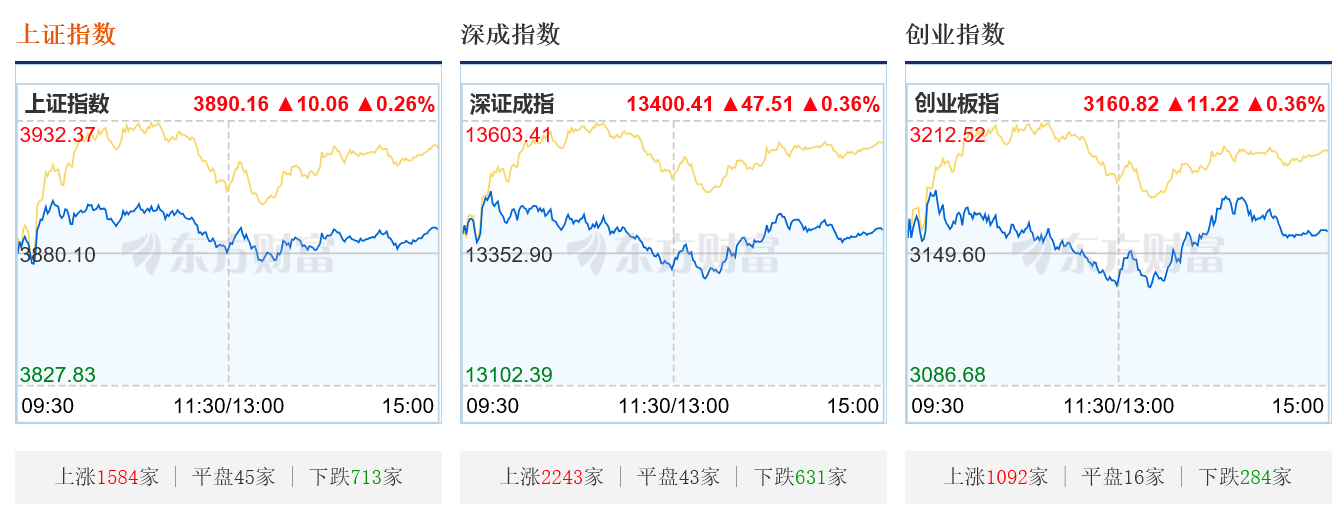 据东方财富网消息,4月7日,A股三大指数今日集体小幅收涨,沪指涨0.26%,收报3890.16点;深证成指涨0.36%,收报13400.41点;创业板指涨0.36%,收报3160.82点。沪深两市成交额1.61万亿,较上一个交易日缩量421亿。