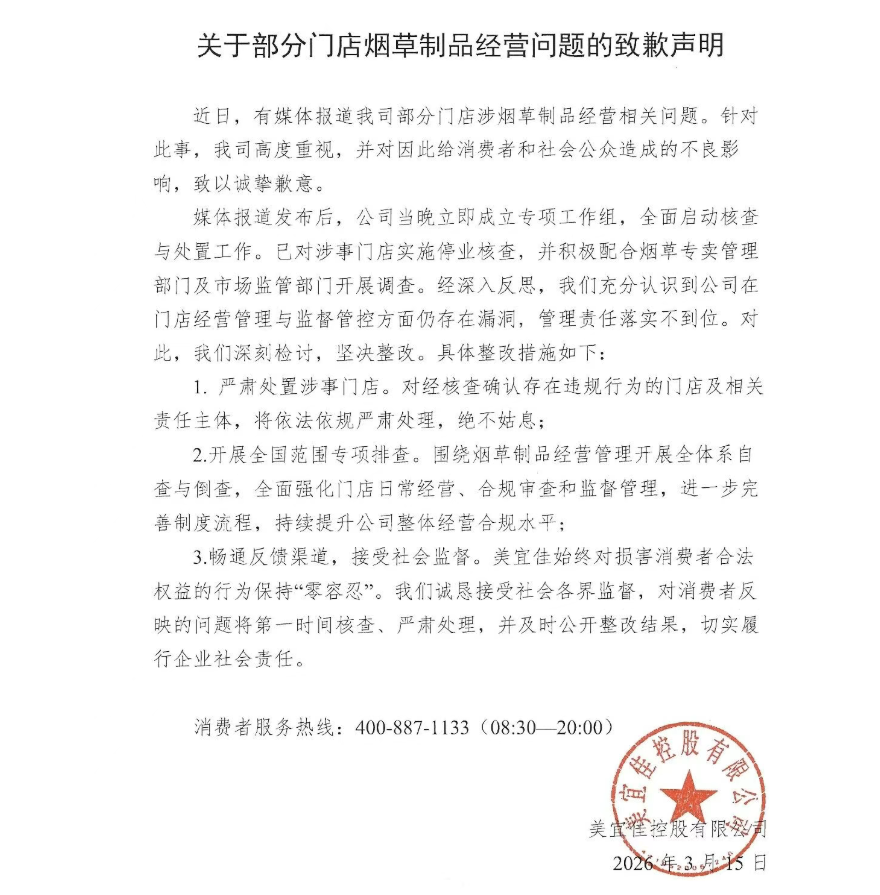 声明称,媒体报道发布后,公司当晚立即成立专项工作组,全面启动核查与处置工作。已对涉事门店实施停业核查,并积极配合烟草专卖管理部门及市场监管部门开展调查。经深入反思,公司充分认识到在门店经营管理与监督管控方面仍存在漏洞,管理责任落实不到位。对此,公司深刻检讨,坚决整改。